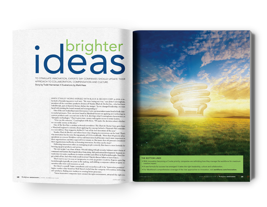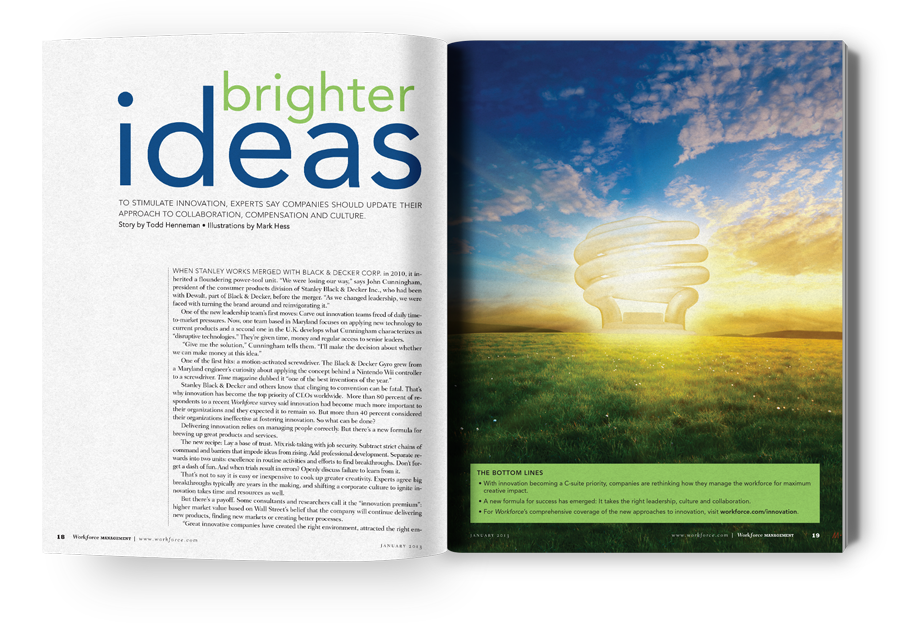 This is an editorial piece for Workforce Management about how "companies that are plugged in to innovation are more likely to light up financially." I worked with illustrator, Mark Hess, who executed my vision beautifully, beyond my expectations.
